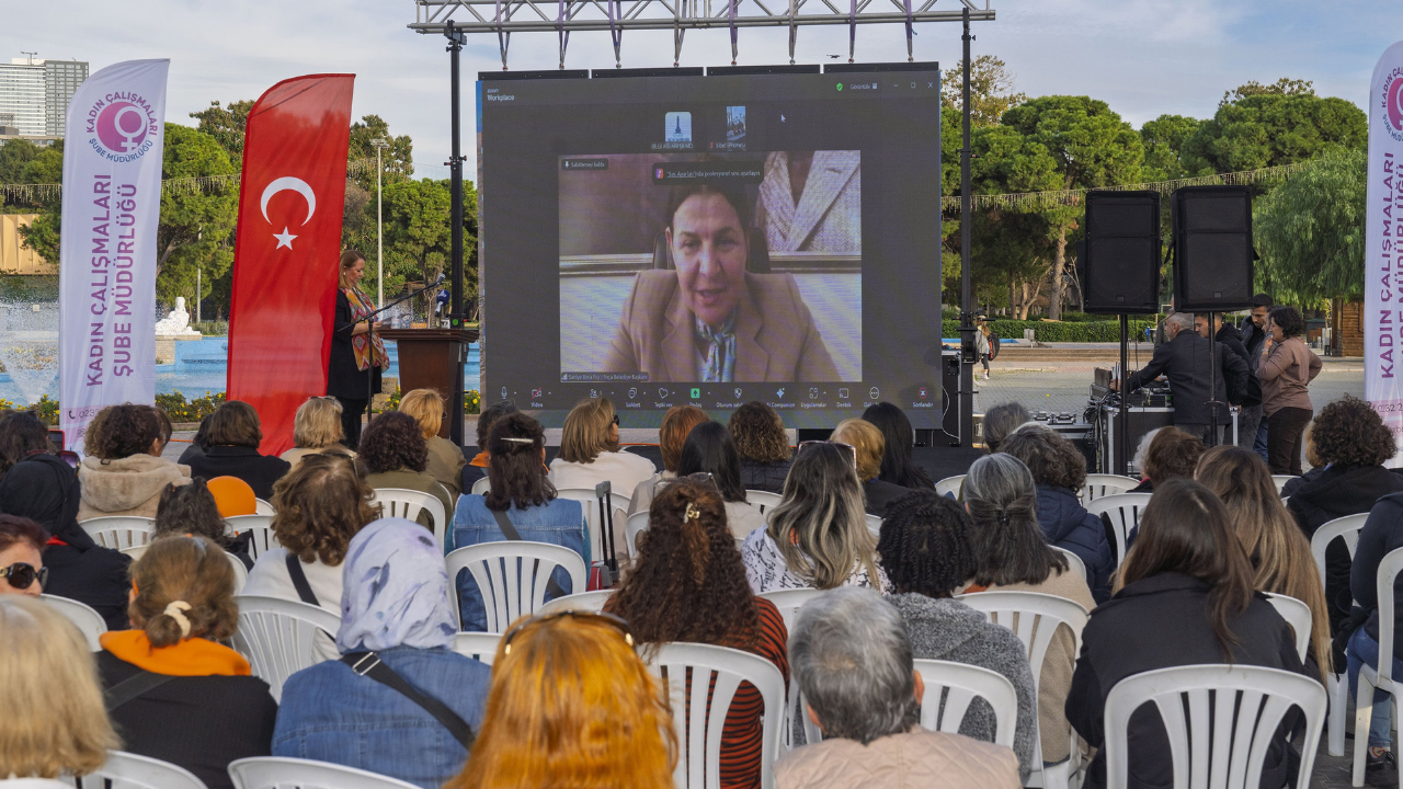 İzmir Büyükşehir Belediyesi Kadın Çalışmaları Şube Müdürlüğü organizasyonunda gerçekleştirilen etkinlikler arasında “Eşit İzmir Eşit Dünya” temalı uluslararası video konferans programı da yer aldı. Kültürpark’ta düzenlenen etkinliğe kadın alanında uzman isimler, işçiler, gazeteciler, akademisyenler, sanatçılar, aktivistler, siyasetçiler gibi farklı alanlardan katılımcılar canlı olarak bağlandı. Kadınlar, şiddete karşı mesajlarını alanda toplanan kadınlara iletti. Her konuşma, kampanya sloganı “Buradayım, iyiyim” cümlesi ile tamamlandı. Alanda bulunan kadınlar da “Buradayım, iyiyim” sloganları attı. Etkinlikte, Çocuk Çalışmaları Şube Müdürlüğü Yenişehir Çocuk Merkezi’nden hizmet alan çocuklar, ritim gösterisi de sundu. Etkinlikte konuşan İzmir Büyükşehir Belediyesi Genel Sekreter Yardımcısı Prof. Dr. Pınar Okyay, “50’den fazla ülkede yaşayan kadınların yarısı, bedenleri hakkında haklarını kullanamıyor. Ne zaman evleneceklerine, kaç çocuk doğuracaklarına erkekler karar veriyor. Bu erkekler önce babalar ve erkek kardeşleri, büyüdüklerinde de eşleri ya da partnerleri oluyor. Aslında bu, bir toplumsal cinsiyet eşitsizliği sorunu ve bu sorun aynı zamanda kadınlara yönelik şiddeti de getiriyor. Ülkemizde çok yakın zamanda yayınlanan istatistiklere göre her 10 kadından biri yaşamı boyunca fiziksel şiddete maruz kalmış oluyor. Her üç kadından biri ekonomik şiddet görüyor. Yolumuz zorlu ama çok kazanım elde ettik. Çünkü birlikteydik. Birlikte olmaya devam edeceğiz. Yoldaşlığınız çok önemli. Eşit İzmir ve eşit bir dünya için bu yol, birlikte yürünecek bir yol” dedi.