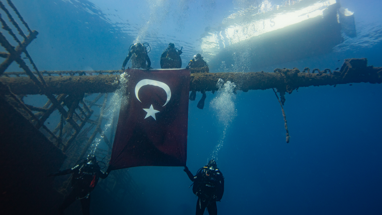 Batık Monem gemisi ve su altında açılan Türk bayrağı, drone ile havadan görüntülendi. Görüntüler, hem geminin battığı alanı hem de bayrağın etkileyici şekilde dalgıçlar tarafından taşınmasını ortaya koydu. Bu etkinlik, Cumhuriyet Bayramı’na anlamlı bir kutlama eklerken, vatandaşlar ve sosyal medyada büyük ilgi gördü.
