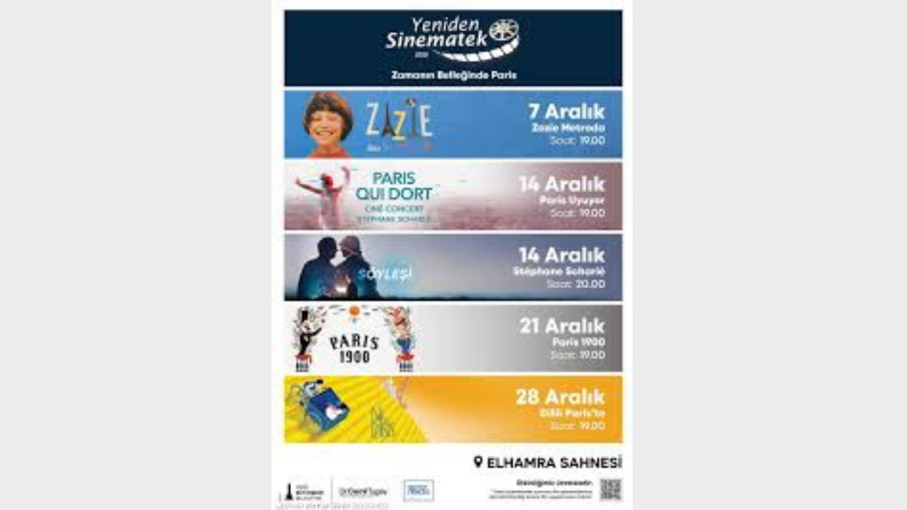 İzmir Büyükşehir Belediyesi’nin “Yeniden Sinematek” gösterimleri, aralık ayı boyunca her pazar saat 19.00’da Elhamra Sahnesi’nde sinemaseverlerle buluşuyor. Bu ayın teması, Institut Français iş birliğiyle hazırlanan “Zamanın Belleğinde Paris” seçkisi oldu. Absürt komediden belgesele, bilim kurgudan animasyona uzanan çeşitli türlerdeki filmler, ücretsiz olarak izleyiciyle buluşacak. Program kapsamında müzisyen Stéphane Scharlé’nin katılımıyla bir sinema konseri ve söyleşi de düzenlenecek.