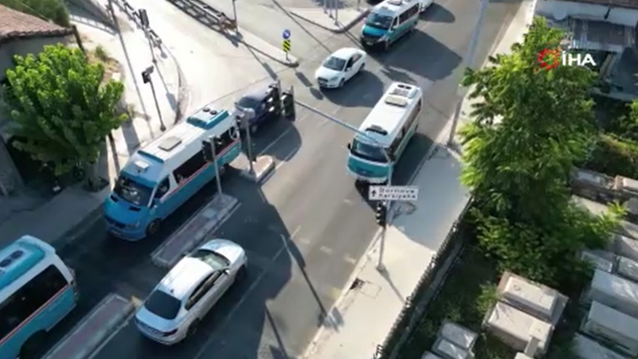 İzmir’in Konak ilçesinde trafikte tehlike saçan bir görüntü yakalandı. Gürçeşme Caddesi’nde zabıta ekiplerinin gerçekleştirdiği dron destekli denetim sırasında, bir yolcu minibüsünün yaptığı kural ihlali dikkat çekti.
