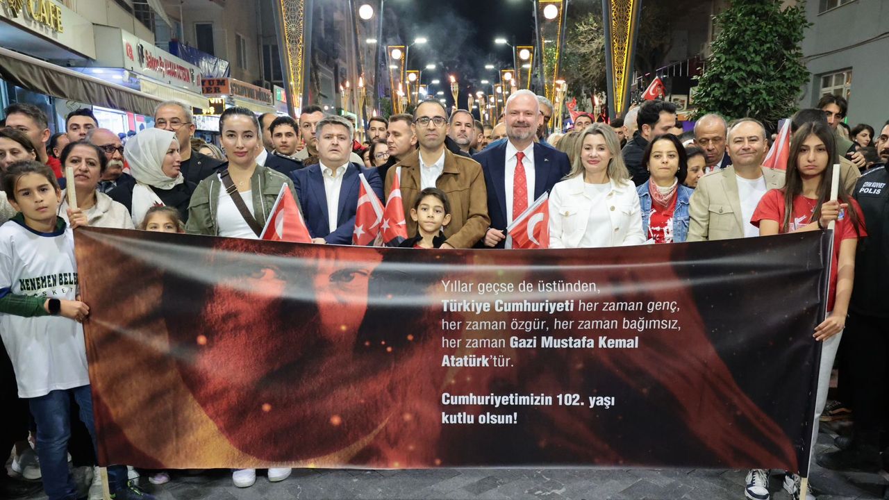 Cumhuriyet’in 102. yılı Menemen’de coşkuyla kutlandı. Menemen Stadı önünden başlayan Cumhuriyet Yürüyüşü, Lise Yolu ve Halil Alkaya Pazar Yeri güzergâhını izleyerek Cumhuriyet Meydanı’nda sona erdi. Menemen Belediye Başkanı Aydın Pehlivan, Menemen Kaymakamı Vedat Yılmaz ve binlerce vatandaşın katıldığı yürüyüşte, marşlar söylendi, bayraklar dalgalandı.