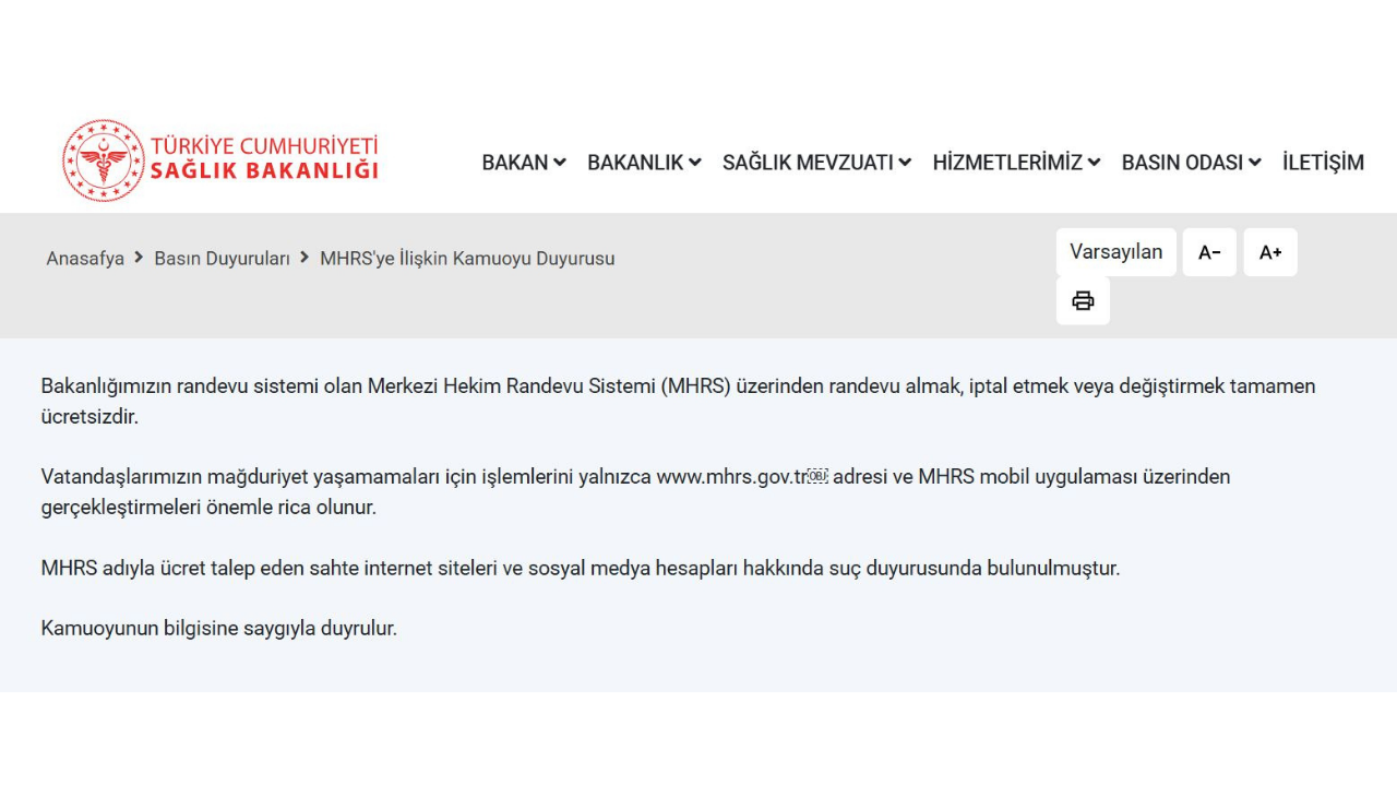 Sağlık Bakanlığı, vatandaşları hedef alan sahte MHRS (Merkezi Hekim Randevu Sistemi) girişimleriyle ilgili harekete geçti. Bakanlık, “randevu alma, iptal etme ya da değiştirme” işlemleri için ücret talep eden sahte internet siteleri ve sosyal medya hesapları hakkında suç duyurusunda bulunulduğunu bildirdi. Bakanlıktan yapılan açıklamada, MHRS üzerinden yapılan işlemlerin tamamen ücretsiz olduğu vurgulandı.