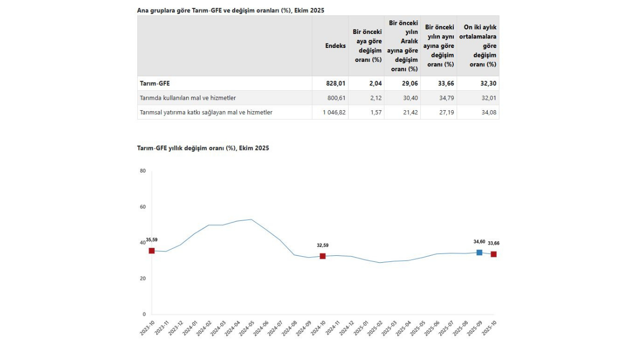 TÜRKİYE İstatistik Kurumu (TÜİK), Ekim 2025 dönemine ilişkin Tarımsal Girdi Fiyat Endeksi (Tarım-GFE) verilerini açıkladı. Buna göre tarımsal girdi fiyatları, ekim ayında bir önceki aya göre yüzde 2,04 artış gösterdi.