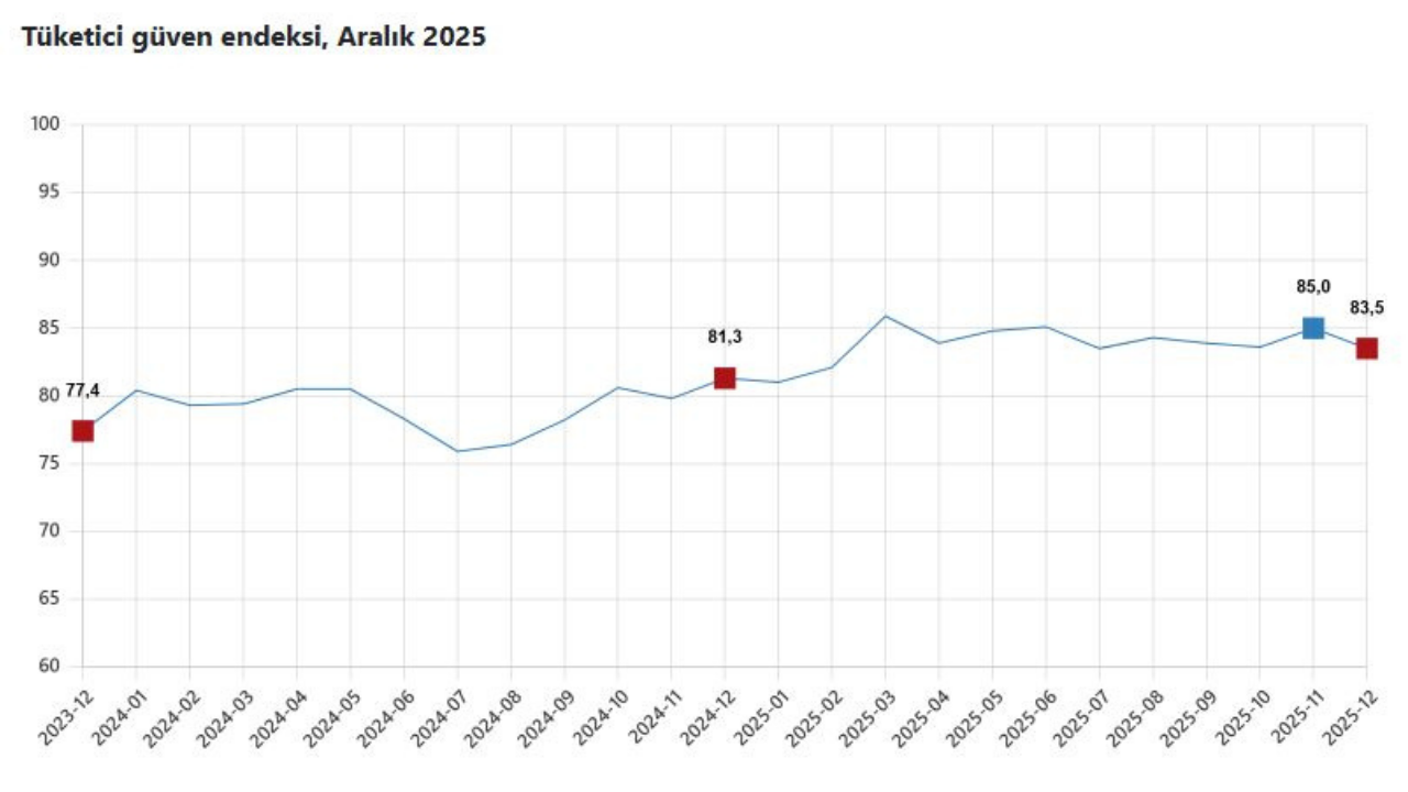 Türkiye İstatistik Kurumu (TÜİK), Aralık 2025 dönemine ilişkin tüketici güven endeksi verilerini açıkladı. Buna göre, tüketici güven endeksi kasım ayına göre yüzde 1,8 oranında azalarak 83,5 seviyesine geriledi.