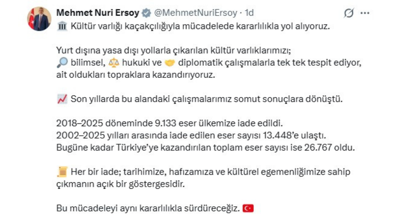 Kültür ve Turizm Bakanı Mehmet Nuri Ersoy, kültür varlığı kaçakçılığıyla mücadele kapsamında yürütülen çalışmalara ilişkin açıklamalarda bulundu. Ersoy, yurt dışına yasa dışı yollarla çıkarılan eserlerin bilimsel, hukuki ve diplomatik girişimlerle Türkiye’ye kazandırıldığını belirtti.