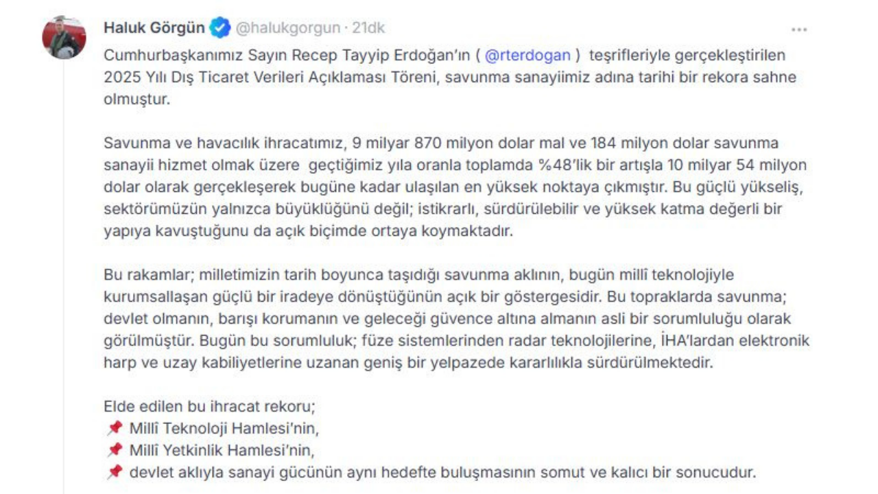 “Bu rakamlar, milletimizin tarih boyunca taşıdığı savunma aklının, bugün milli teknolojiyle kurumsallaşan güçlü bir iradeye dönüştüğünün açık göstergesidir”