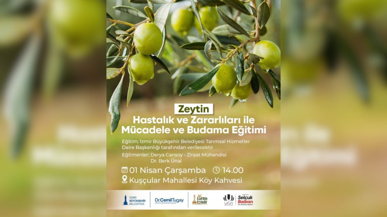 İzmir Büyükşehir Belediyesi Tarımsal Hizmetler Daire Başkanlığı uzmanları tarafından verilecek eğitimde, zeytin ağaçlarında sık görülen hastalıklar, zararlılarla mücadele yöntemleri ve doğru budama teknikleri detaylı şekilde ele alınacak.