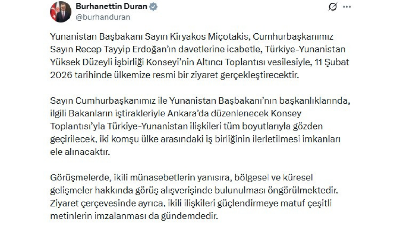 Duran, sosyal medya hesabından yaptığı açıklamada, ziyaretin Türkiye-Yunanistan Yüksek Düzeyli İşbirliği Konseyi’nin Altıncı Toplantısı kapsamında gerçekleşeceğini belirtti. Açıklamada,
